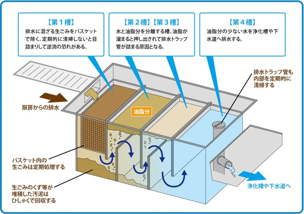 業務用厨房にはグリストラップの設置が義務付けられており、適切な清掃・管理も求められます。