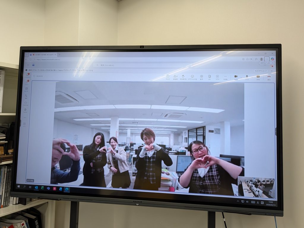 会議用で使用する大画面を通して本社とつながり、社内の様子を見合えるスタイルになりました。